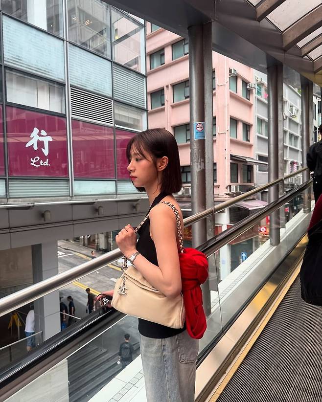 어깨에 걸친 화이트 레더 숄더백은 체인 스트랩으로 포인트를 더했으며, 묶어 든 레드 컬러의 상의는 전체 착장에 활기를 불어넣는 디테일로 작용했다. 과하지 않은 미니멀한 액세서리 활용 또한 그녀의 감각적인 스타일을 돋보이게 한다.