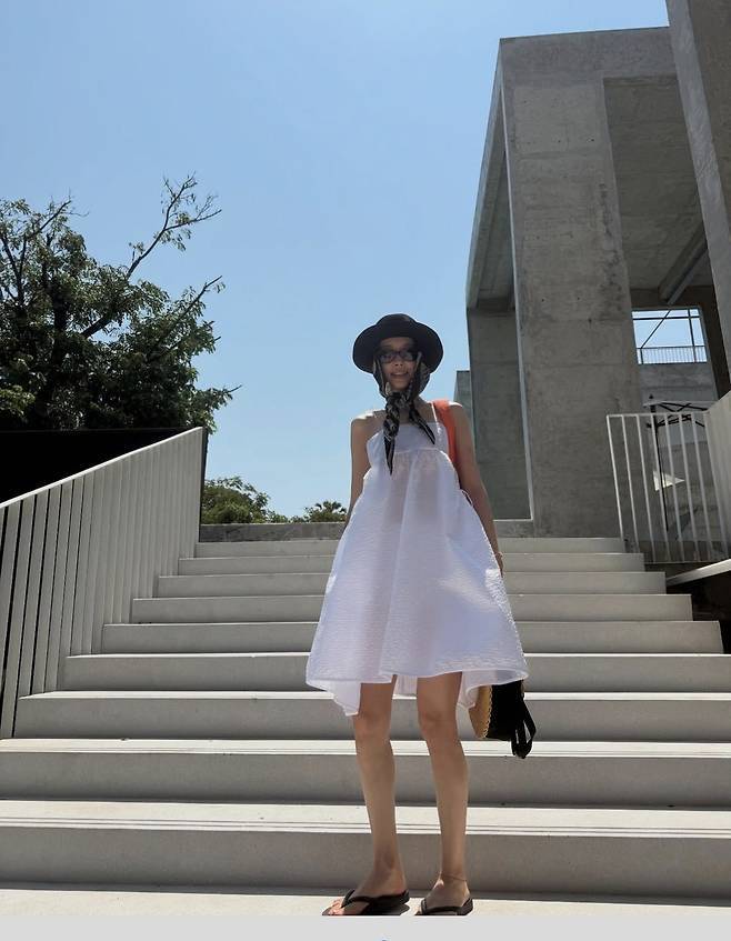 손나은은 순백의 벌룬 미니드레스에 블랙 페도라와 스카프를 매치해 이국적인 분위기를 자아냈습니다.