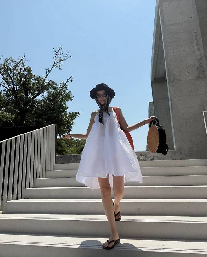 블랙 선글라스로 트렌디함을 더한 그녀는 편안한 플립플롭과 라탄백으로 완벽한 보헤미안 리조트룩을 완성했습니다.