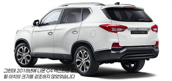 그렇지만 2018년에 등장했던 G4 렉스턴은 차체 크기가 커져서 강조할 필요가 없다고 판단했던 것인지, 오히려 휠 아치를 강조하지 않은 디자인으로 나왔었습니다. 그래서 오히려 좀 밋밋한 인상이었습니다.