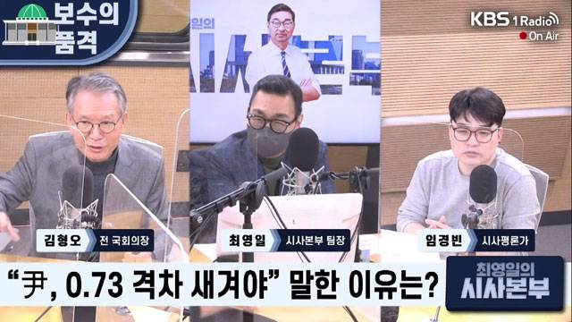 ▶ 김형오 : 0.73%라는 것을 나는 항상 나는 뭐 명패로까지 하든 아니든 가슴 속에 0.73%라는 것을 윤 대통령이 가슴에 새기고 그걸 잊지 않고 정치에 임하면 나는 어떻게 되냐. 그것만 잊지 않고 가슴에 새긴다면 73% 지지받고 떠난다 내가 그렇게 얘기를 한 적이 있어요.