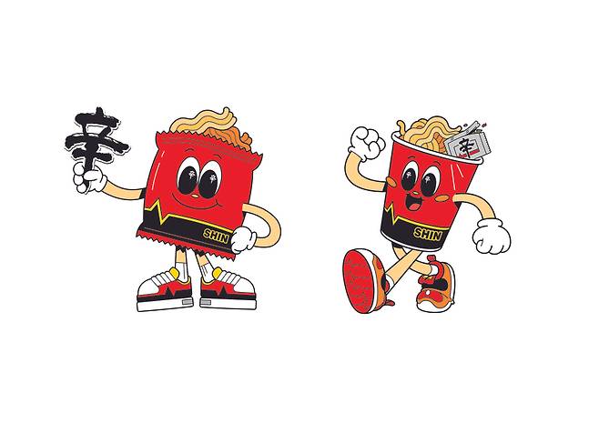 농심은 SHIN 캐릭터의 외형에 신라면 고유의 정체성을 담아냈습니다. 라면 면발과 신라면 봉지를 연상시키는 디자인을 바탕으로 눈동자와 소품에 ‘辛(매울 신)’ 자를 포인트로 활용했으며, 신발에는 맥박이 뛰는 펄스(Pulse) 디자인을 적용해 생동감을 살렸습니다.