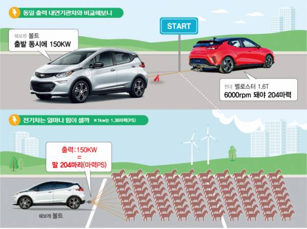 예컨대 최고출력 150kW(204마력)의 전기차인 쉐보레 볼트와 최고출력 204마력을 내는 내연기관 현대차 벨로스터1.6 터보의 차이는 확연하다. 환산 마력은 두 모델(204마력)이 같지만, 초기 출발과 가속력은 쉐보레 볼트의 압승이다.
