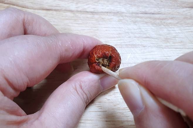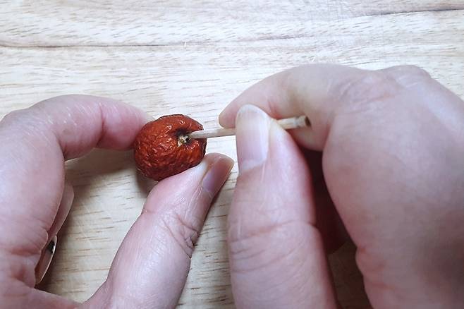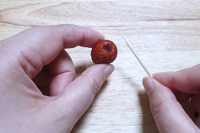 방법은 간단해요. 먼저 이쑤시개로 대추에 콕 찔러 속으로 점점 들어가면서 씨 겉면을 2바퀴 정도 빙 돌려주세요.