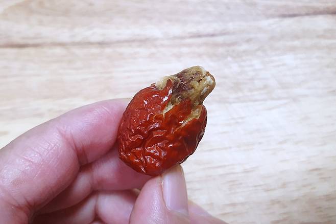 이쑤시개로 뺀 대추씨예요. 대추의 모양이 손상되지 않도록 깔끔하게 잘 분리가 됐어요.