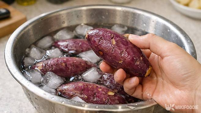 얼음물에 담그는 과정은 단맛뿐 아니라 식감에도 영향을 준다. 고구마를 물에 담가두면 세포 사이로 수분이 스며든다. 이 상태에서 조리를 시작하면 열이 내부까지 고르게 전달된다.