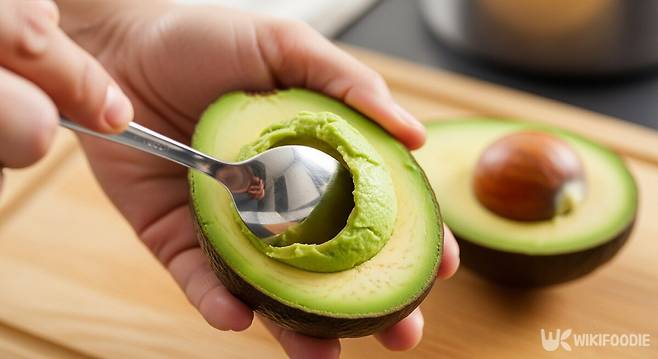 1. 아보카도를 칼로 반 자른 뒤 비틀어 두 조각으로 나눈다. 씨를 숟가락으로 조심스럽게 빼내고, 껍질 안쪽을 숟가락으로 파낸다.