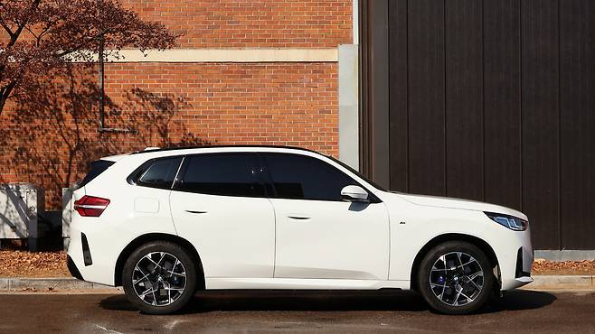 측면 디자인이다. 일반적인 SUV와 다르게 플라스틱 언더커버, 특히 휠아치 부분 가니시가 별도로 부착되어 있지 않다. 단지 휠 하우스 상단의 볼륨 라인으로 SUV의 강인함을 표현했다. 이런 스타일링 기법으로 인해 전통적인 SUV의 분위기와는 이질감이 생긴다. 그에 대한 평가는 주관적일 것 같다. 벨트라인은 전방부 위치를 최대한 낮추고, 뒤로 갈수록 좁혀지는 형태를 갖추었다. C필러 라인도 나름 쐐기 형태로 디자인하여 역동적인 인상이 있다. 차체 전방부에 무게가 실려있는 디자인은 BMW가 SAC 장르에서 오랜 기간 강조해온 형태와 같다.