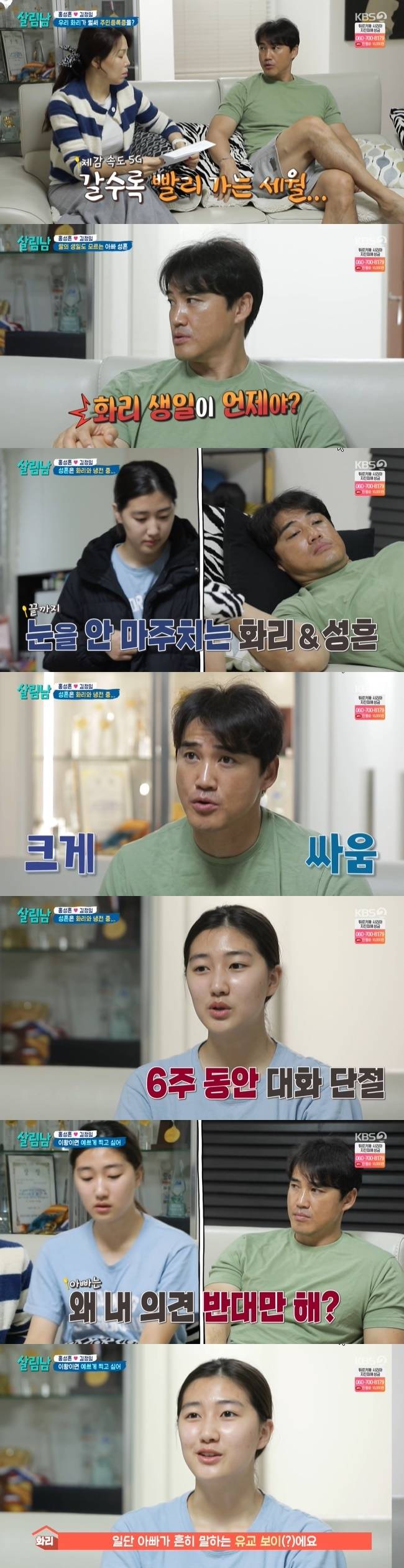 그때 집에 홍화리가 도착했지만, 부녀는 서로 눈을 마주치지 못한 채 어색해 했다. 홍성흔은 “화리랑 사이가 굉장히 좋았는데 최근에 사소한 일로 크게 싸웠다”라고 말했다. 홍화리는 “홍이(반려견) 때문에 아빠랑 싸웠는데 6주 동안 말을 안 했다”라고 털어놨다.