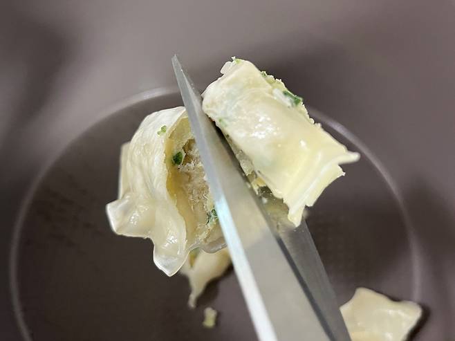 이 떡만둣국은 국거리 고기가 필요하지 않습니다. 고기 대신 우리는 "고기만두"를 사용하면 됩니다. 가위로 고기만두를 잘게 썰어 주세요. 냉동 만두라면 상온에 두어 부드럽게 만드세요.