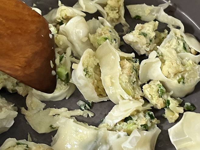 냄비에 기름을 살짝 붓고 고기만두 썬 것을 달달 볶습니다. 기름을 두르지 않으면 눌어붙기 때문에 기름 소량 꼭 두르세요. 만둣속을 볶아 맛있는 향이 날 때까지 볶으세요.