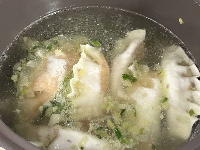 육수가 우러 져 나오면 만두를 넣습니다. 고기만두 또는 김치만두 등 원하시는 것을 넣어 주세요. 저는 6~7개 넣으니 2인분 양으로 딱 적당했습니다. 만두는 중 약불로 3~4분 끓이면 됩니다.