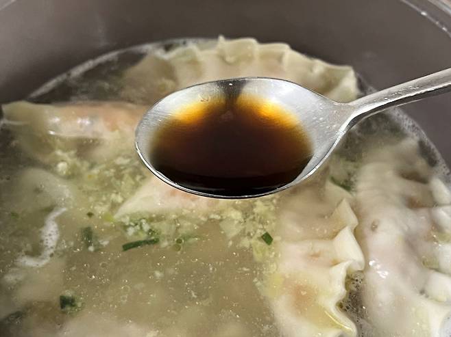 깔끔한 국간장으로 간을 맞춥니다. 이미 만두소에 조미료 등이 들어갔기 때문에 다른 조미료 없이, 국간장으로만 간을 맞추는 게 좋습니다. 국간장 2스푼 넣으세요.