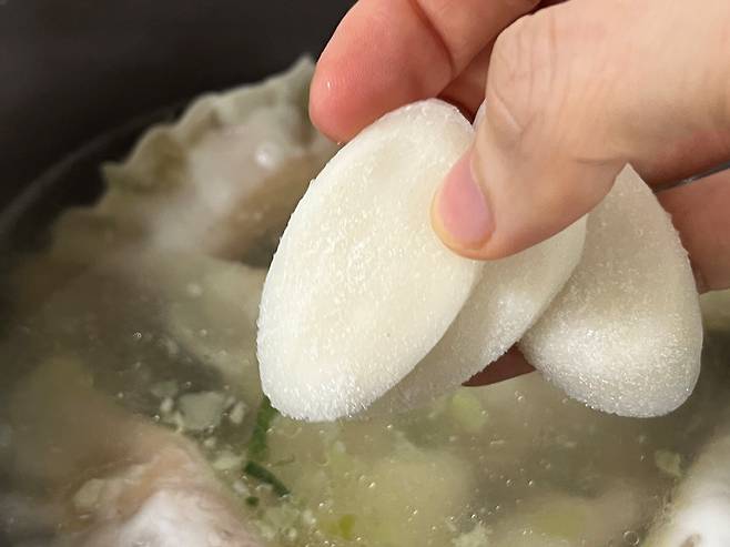 떡도 함께 넣습니다. 냉동떡은 바로 넣어도 되지만 조금 더 부드러운 식감으로 즐기고 싶다면 물에 넣어 녹인 후 국에 넣으세요.