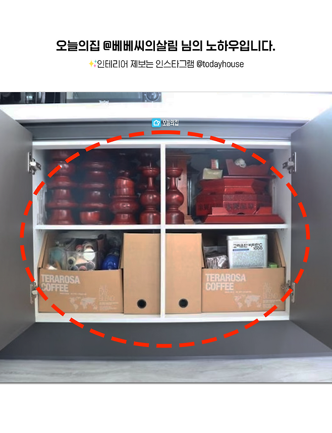 다섯 칸의 하부장 중에서 가장 넓은 공간인 저 두 칸을 제일 많이 사용하고 있는데, 아무래도 바깥 베란다에 있다보니 효율적으로 정리가 안되고 자꾸 창고처럼 쓰게되는 되더란 :(