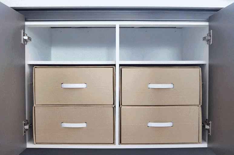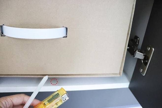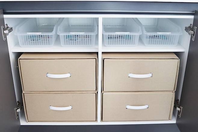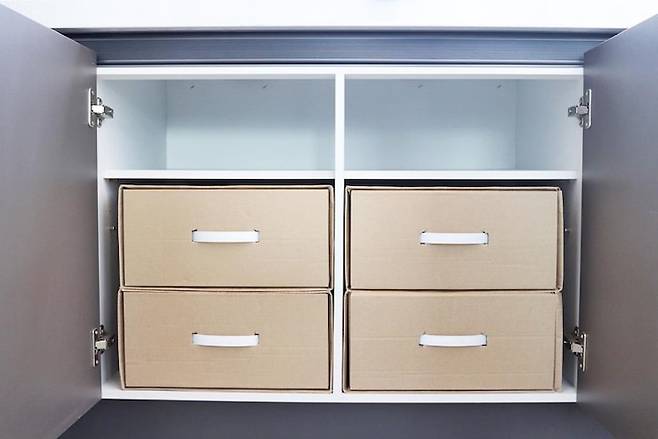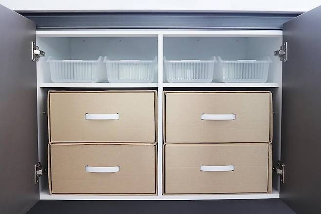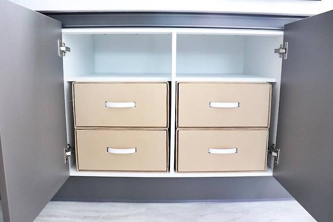 기존 하부장 선반을 종이 서랍장에 맞추어 높이를 조절하고 조립한 서랍장을 하부장 안으로 들인다.