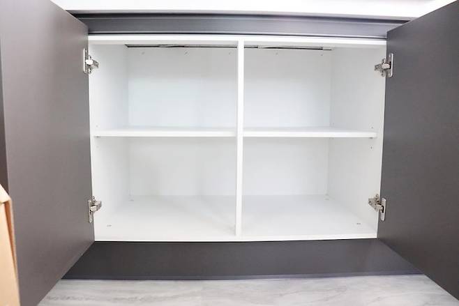 기본 수납 공간이 많이 부족한 편이라 하부장을 팬트리처럼 쓰고 싶어서 손잡이 없는 민자형의 문짝을 설치해 깔끔한 내부수납을 계획했었다.