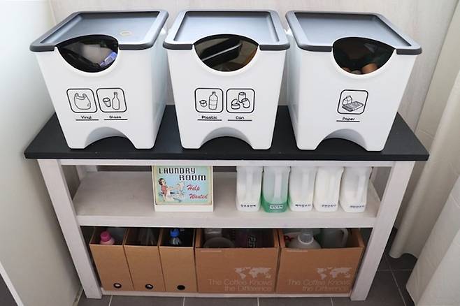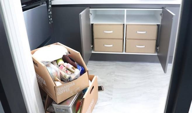 하부장에 있던 박스들은 세탁실로 보내고 하부장을 다시 비우고, 정리하고, 수납하기로 했다.