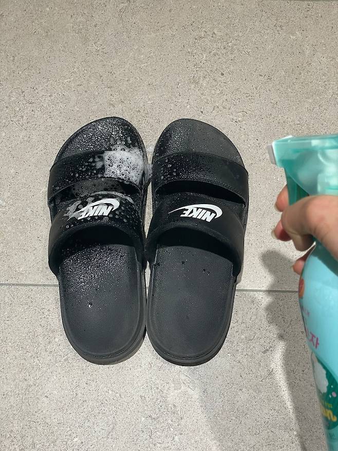 풋샴푸를 크록스에 칙칙 뿌리고 10분 정도 방치해 두어요.