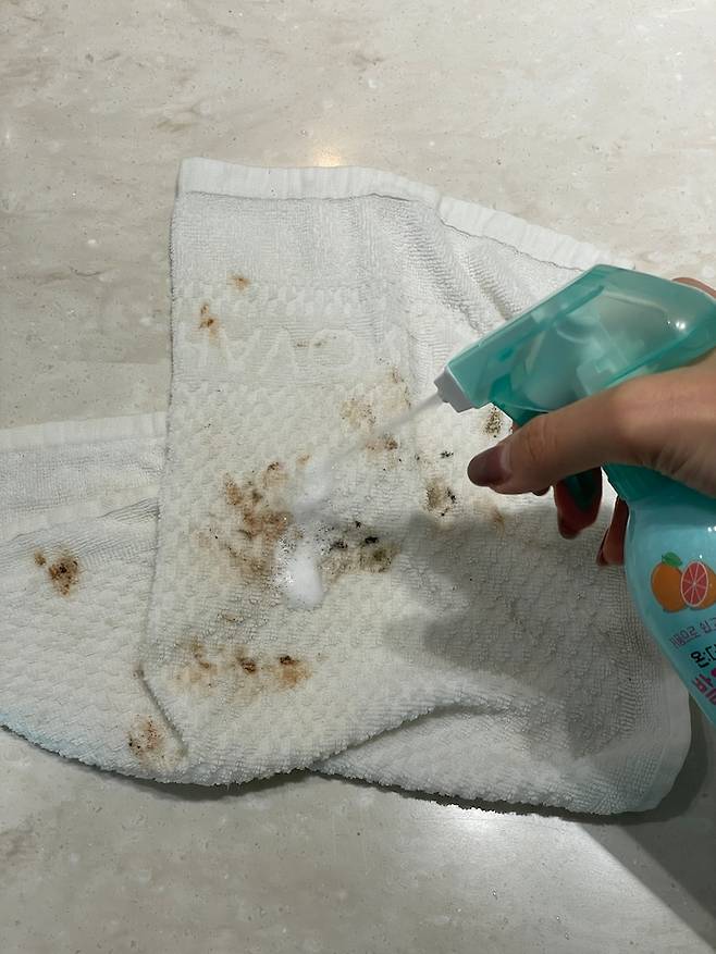 저는 기름때 묻은 수건과 김치 국물 묻은 옷에 풋샴푸를 칙칙 뿌리고, 손으로 문질문질한 다음 OO 분 후에 세탁기에 돌려 줬어요.