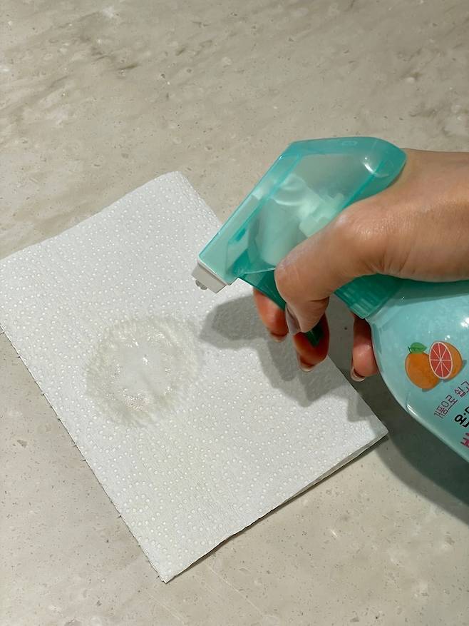키친타올에 풋샴푸를 3-5회 뿌린 뒤 젖은 키친타올로 닦아 내 주세요.