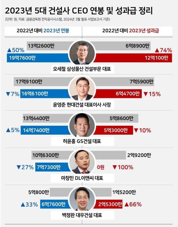 땅집고는 금융감독원 전자공시시스템에 공개된 국내 ‘빅 5 건설사’(삼성물산·현대건설·GS건설·DL이앤씨·대우건설)의 2023년 사업보고서 중 임원 보수 항목을 집계했다. CEO 연봉은 급여와 성과급(상여), 기타 근로소득 등의 총합으로 구성한다.