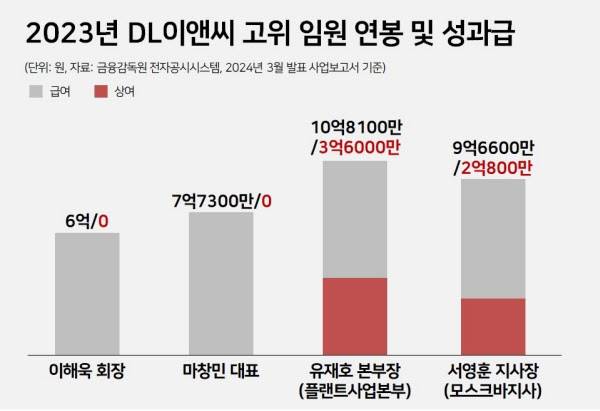 대림가(家) 오너 3세인 이해욱 회장의 경우 지난해 급여가 6억원으로, 전년(12억원) 대비 절반에 그친다. 회사 경영이 악화해 이 회장이 받은 성과급 역시 0원으로 책정된 영향이다. 반면 이 회장과 마 대표를 제치고 사내 ‘연봉킹’ 자리에 오른 인물이 나와 주목된다. 플랜트사업본부의 유재호 본부장(10억8100만원)과 서영훈 모스크바지사장(9억6600만원)이다. DL이앤씨 주택 부문 실적이 저조했던 반면, 해외 실적은 선방하고 있어 두 인물 성과급이 각각 3억6000만원, 2억800만원으로 높았다.