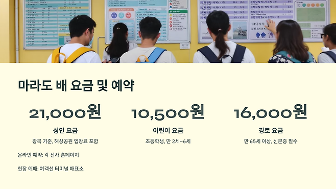 현장 예매: 각 여객선 터미널 매표소에서 현장 구매도 가능합니다. 하지만 매진될 수 있으므로 미리 예약하는 것을 추천합니다.