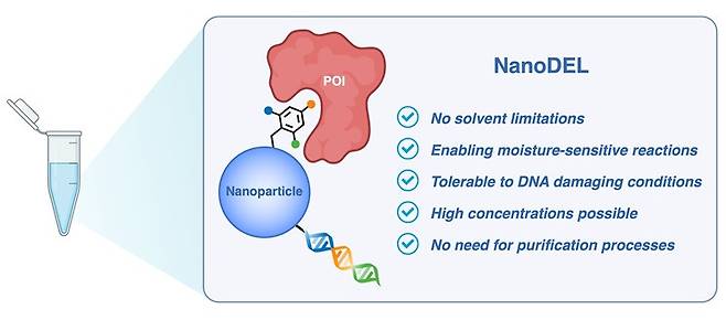 연구팀은 나노입자 표면에 DNA와 화합물을 결합시킨 ‘나노DEL(NanoDEL, Nanoparticle-Based DEL)’을 개발했다. 나노입자는 물뿐만 아니라 유기 용매에서도 안정적으로 분산될 수 있기 때문에, 기존 DEL 기술로는 불가능했던 ‘무수반응(moisture-sensitive reactions)’ 등 용매 종류에 상관없이 다양한 화학 반응을 자유롭게 수행할 수 있다.