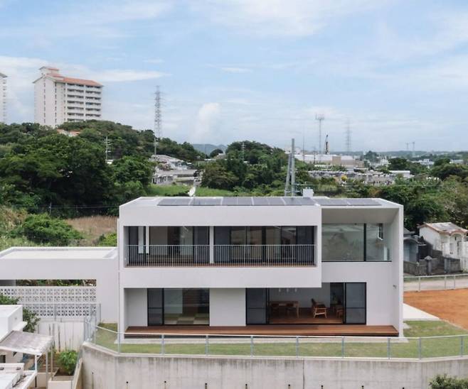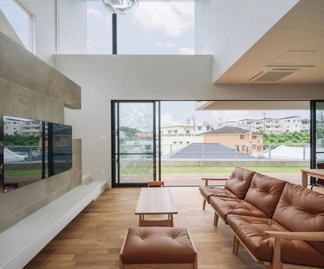 오키나와에 위치한 이 주택은 놀라운 전망을 자랑합니다. 거실에 들어서면 가장 먼저 눈에 띄는 것은 천장까지 열린 광대한 공간입니다. 이곳의 2층 높이의 거실 상부에는 동쪽과 남쪽을 향한 '하늘과 연결된 창문'이 자리 잡고 있습니다.