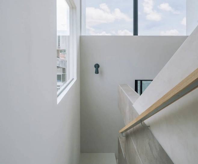 2층으로 올라가는 계단은 거실의 동쪽 벽면을 따라 배치되었습니다. 완전히 분리된 계단실을 만들면 거실이 좁아질 수 있기에 칸막이 벽의 높이를 최대한 낮추었습니다. '하늘과 연결된 창문'까지 공간을 하나로 통합하여 더 넓게 느껴지도록 설계했습니다.