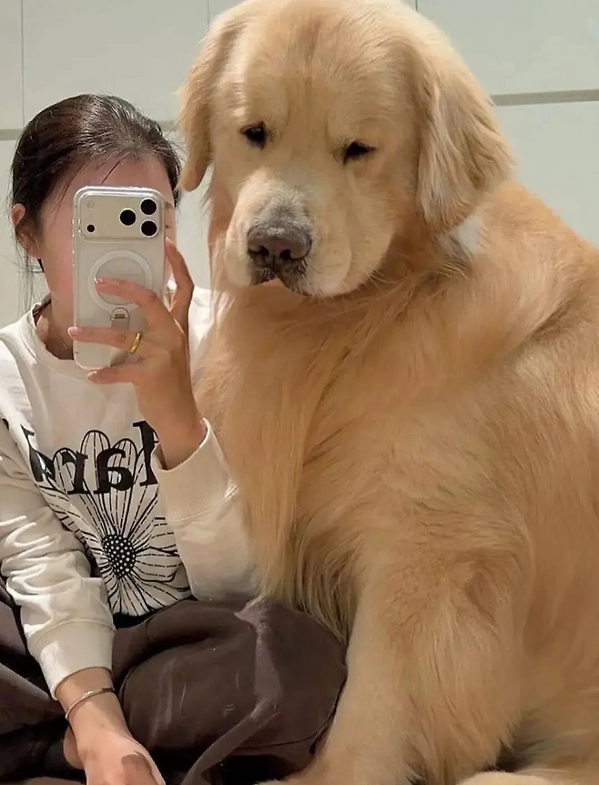 한 반려인이 공개한 사진 속 골든 리트리버는 몸무게가 무려 **42kg**에 육박하는 거구다. 반려인이 일상을 기록하기 위해 녀석과 함께 거울 앞에 서자, 녀석의 거대한 덩치가 화면을 가득 채웠다.