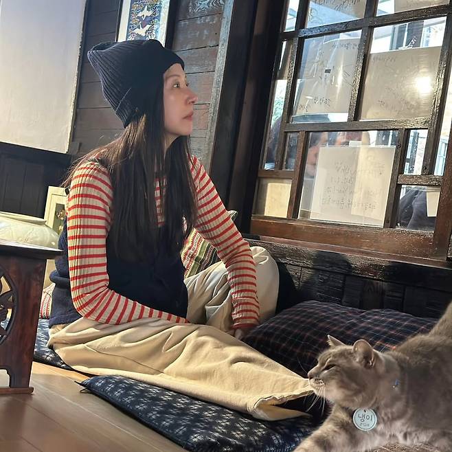 그녀가 공개한 사진 속 모습은 편안함 그 자체였습니다. 그녀는 붉은 스트라이프 티셔츠에 베이지색 와이드 팬츠를 매치해 '꾸안꾸' 패션의 정석을 보여주었습니다. 여기에 검은색 비니를 더해 20대 같은 힙한 감각을 뽐내며 시선을 사로잡았습니다.