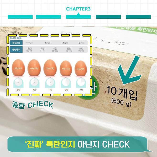 따라서 달걀을 사기 전에 꼭 어떤 사이즈의 달걀인지 실중량을 체크하도록 해요. 보시다시피 특란은 하나당 60g 이상인 계란을 뜻해요. 따라서 10구는 600g, 30구는 1.8kg이 되어야 특란이 될 수 있어요.