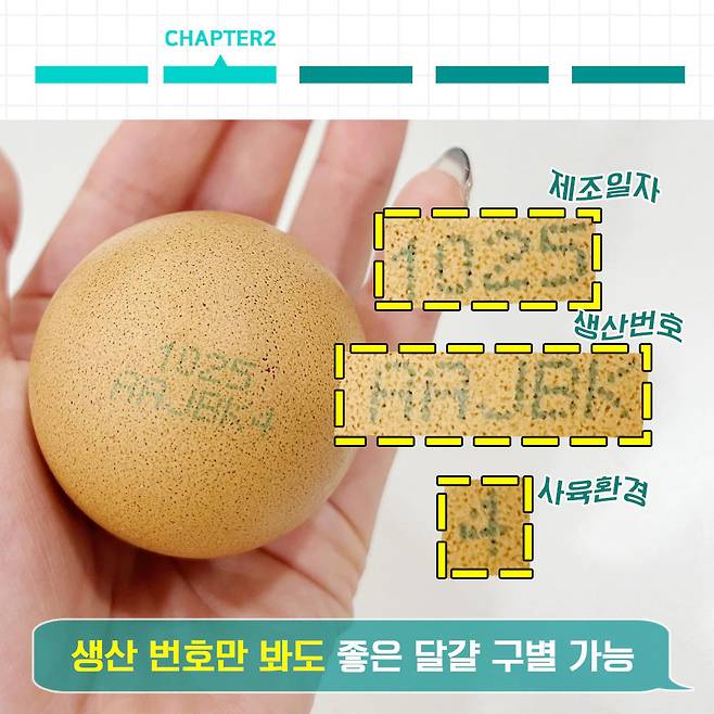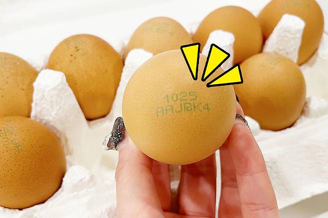 달걀 껍데기에 적힌 번호는 모두 10자리로, 기존 생산자의 고유번호와 사육번호 6자리와 생산일자 4자리로 이루어져 있어요. 10월 25일에 생산되었으므로 맨 앞자리 4자리가 ‘1025’로 표기되었죠? 다음 뒷부분 5자리는 어느 지역에서 생산된 달걀 인지를 나타내요.