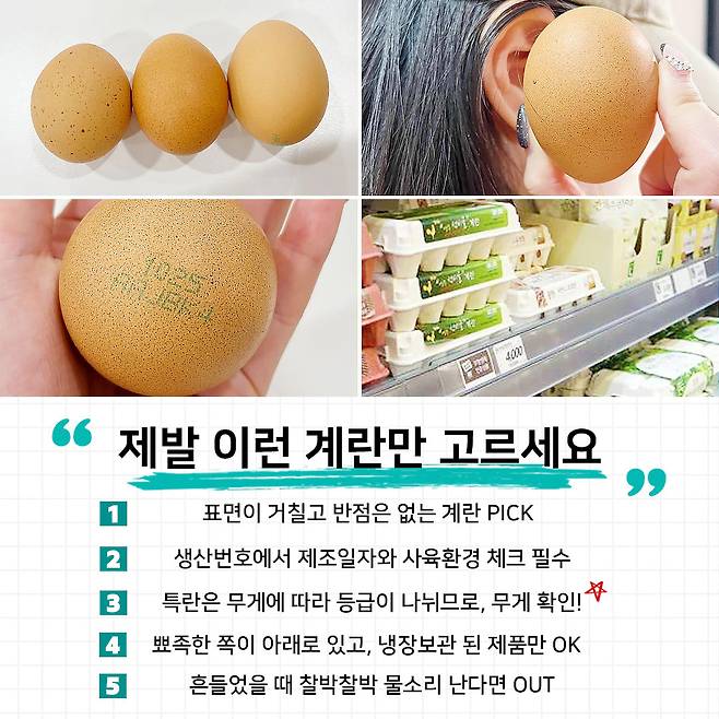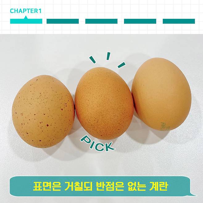 이제 검은 반점 계란을 골랐던 여러분 주목. 반점 무늬가 신선(?)하다고 느껴질 수 있지만, 껍질에 반점이 있는 것보다 깨끗한 계란이 더욱 좋은 달걀이에요. 따라서 계란을 고를 때에는 손으로 만졌을 때 표면이 거칠고 단단한 것으로 골라야 한다는 사실 꼬옥 기억해요★