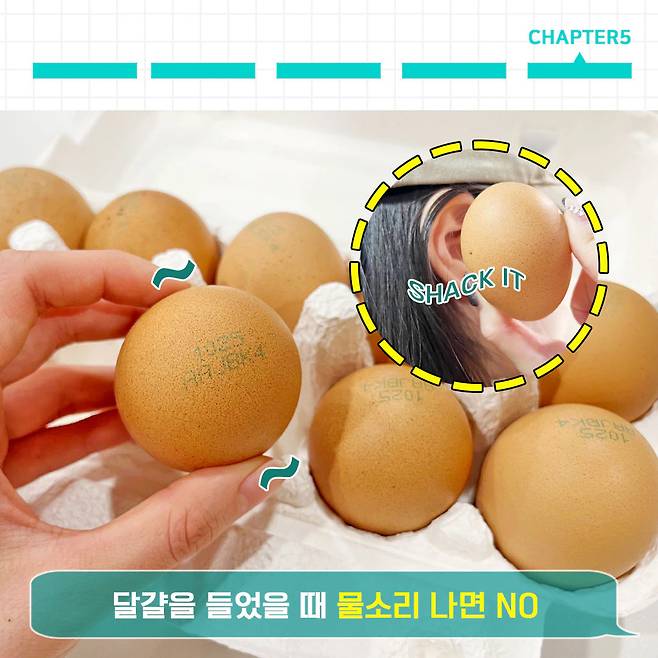 계란을 흔들었을 때 출렁이는 소리가 난다면 신선도가 떨어진 제품일 가능성이 높아요. 아까도 잠깐 언급했듯이 달걀은 시간이 지나면서 껍질을 통해 수분과 이산화탄소를 잃어요. 즉 흰자와 노른자는 수분을 잃게되고, 그 사이에 더욱더 많은 공기가 차게 되는 것!