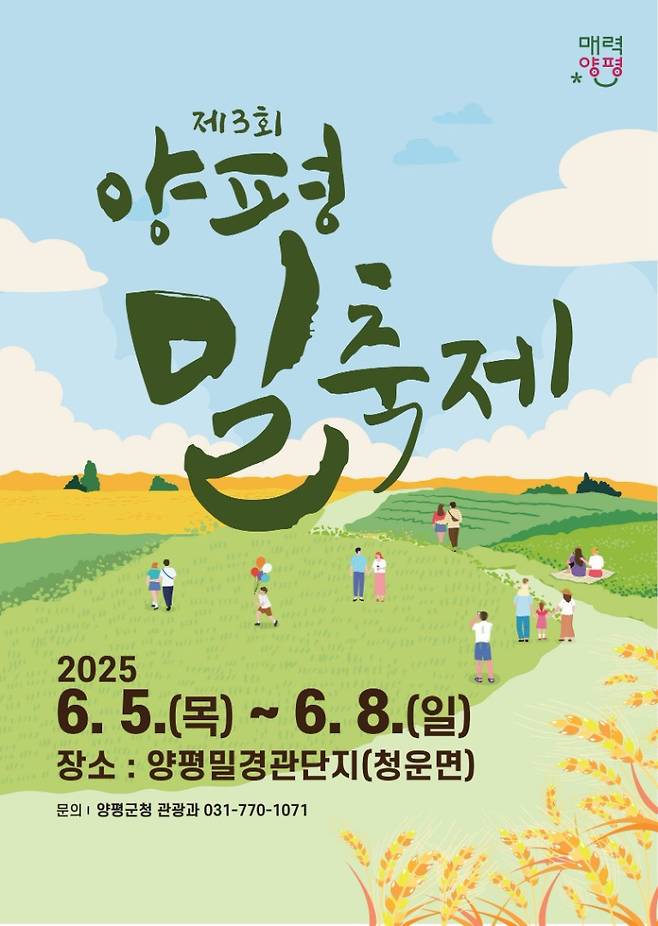6월의 양평은 그야말로 황금빛으로 물든 들녘이 펼쳐지는 계절이에요. 올해로 3회째를 맞는 ‘양평 밀 축제’는 청정한 우리밀의 가치와 매력을 오감으로 즐길 수 있는 건강하고 감성적인 축제랍니다.