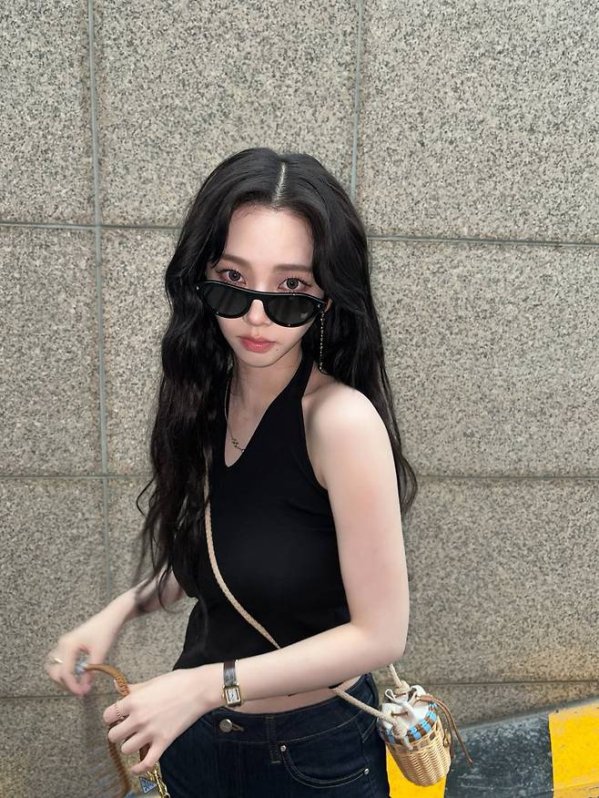 공개된 사진에서 에스파 카리나는 롱 웨이브 헤어와 선글라스로 무심한 듯 시크한 여름 룩을 완성했다.