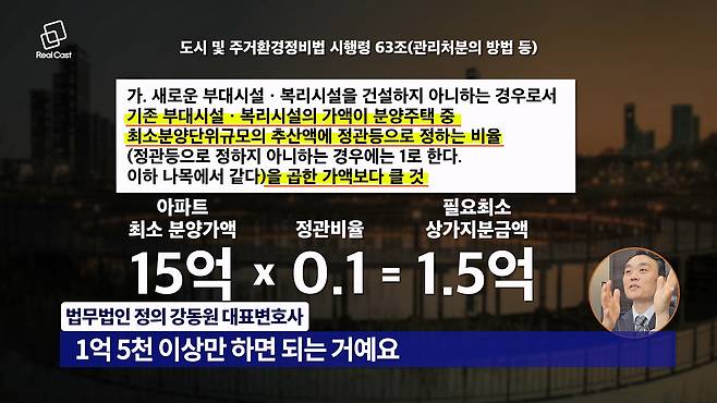 A. 강동원 변호사 : 그렇죠. 그게 법의 시행령에 나와 있는데 정관에 정한 그 비율을 곱하게 돼 있어요. 이게 무슨 말이냐면 정관에서 만약에 비율을 0.1이라고 정했다고 해 봅시다. 근데 아파트 최소 분양 단위 가액이 15억짜리 아파트다 그러면 최소 분양가액이 곱하기 0.1이니까 1억 5천이잖아요. 그러면 상가 내 지분이 1억 5천 이상만 하면 되는 거예요.