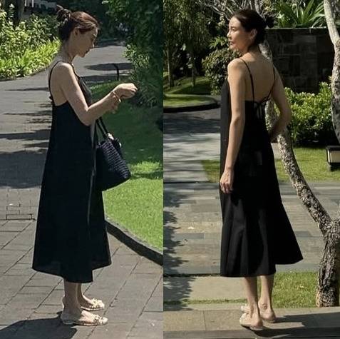 얇은 스트랩과 깊게 파인 백라인으로 세련된 분위기와 은은한 섹시미를 더했고, 투명 샌들과 블랙 토트백으로 미니멀한 리조트룩을 완성했습니다.