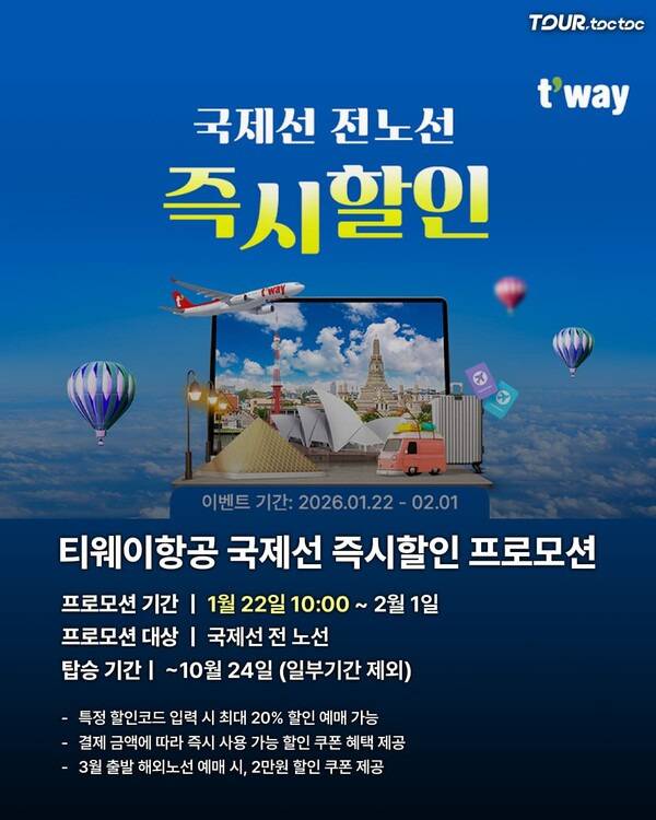 티웨이항공이 1월 22일 10시부터 2월 1일까지 국제선 전 노선을 대상으로 즉시할인 프로모션을 진행합니다.
