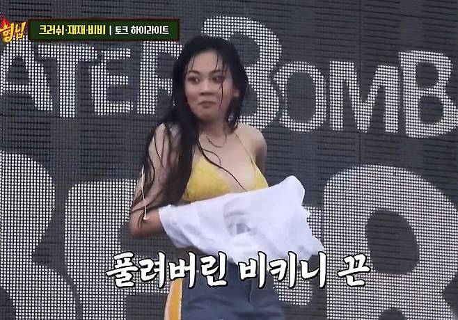 비비는 "티셔츠를 딱 벗었는데 끈이 풀려서 큰일 날 뻔했다"라며 "원래 스티커 같은 걸 안 붙이는데 그날따라 스태프가 붙이라고 저를 설득하더라. 등에도 스티커를 붙였는데 뒤에는 물에 젖어 풀리고 앞에는 남아있었다"라고 상황을 설명했다.