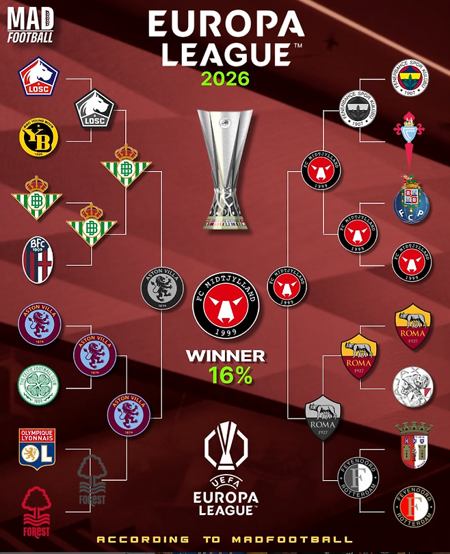 객관적으로 봤을 때 16%라는 수치 자체가 높은 편은 아니지만, 유로파리그보다 한 단계 낮은 대회로 분류되는 UEFA 콘퍼런스리그도 아닌 유로파리그임에도 불구하고 미트윌란이 쟁쟁한 팀들 사이에서 유로파리그 우승 후보로 지목됐다는 것 자체가 놀라운 일이다.