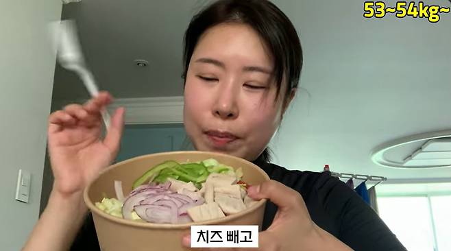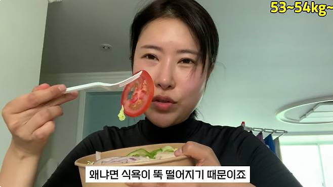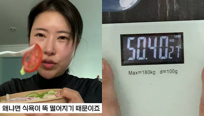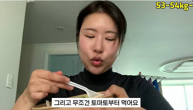 특히 샐러드를 먹을 때는 드레싱을 빼고 양상추, 피망, 양파, 토마토만 넣어 먹으며, "무조건 토마토부터 먹는다. 그러면 식욕이 뚝 떨어진다"고 강조했다.