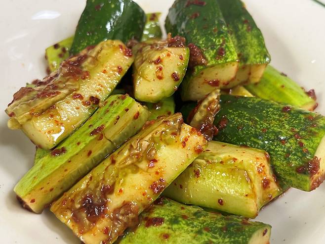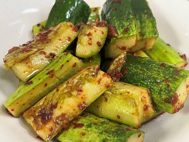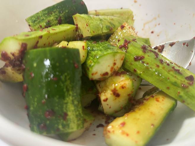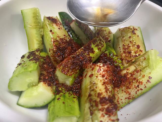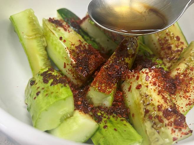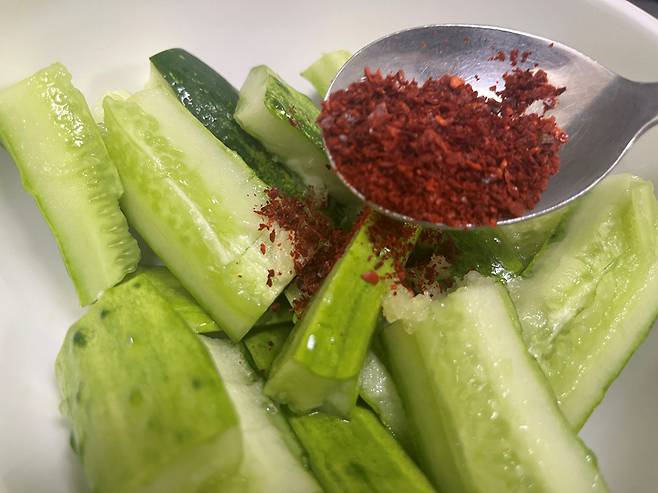 고춧가루는 오이 1개 기준 1/2스푼 넣어 주세요. 매운맛을 좋아한다면 청양고추 등을 추가해도 좋습니다.