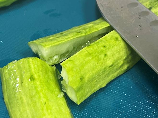 오이무침할 때 오이를 그냥 뭉툭하게 자르기보다는 방망이나 칼등으로 두드려 보세요. 오이에 균열이 생기면서 양념이 훨씬 잘 배어들어 새콤달콤한 맛이 속까지 스며듭니다.