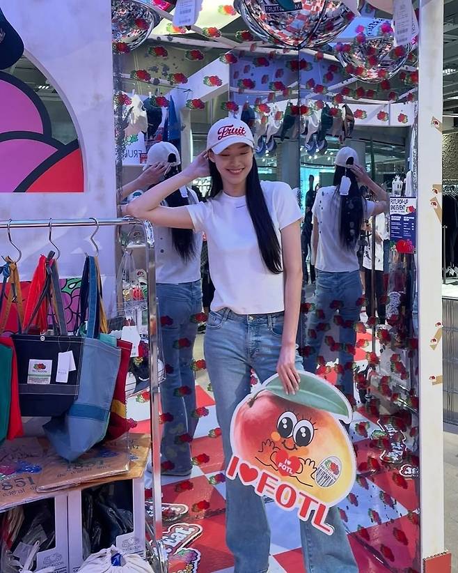 팝업스토어 공간 자체도 그녀의 스타일링을 더욱 돋보이게 했다. 거울과 꽃 장식이 가득한 공간 속에서, 김설희의 밝고 경쾌한 무드가 공간과 조화를 이루며 한 폭의 화보 같은 장면을 연출했다. 이번 팝업스토어는 미국의 빈티지 과일 마켓을 모티브로 한 콘셉트로 꾸며졌으며, 그녀는 현장 분위기에 맞춘 편안하면서도 생동감 있는 스타일링을 완벽하게 소화했다.