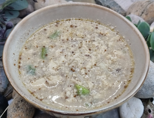 -국물이 끓으면 들깨가루 4큰술을 풀어 넣습니다.뭉치지 않게 잘 저어주세요.고소한 풍미가 진하게 퍼집니다.