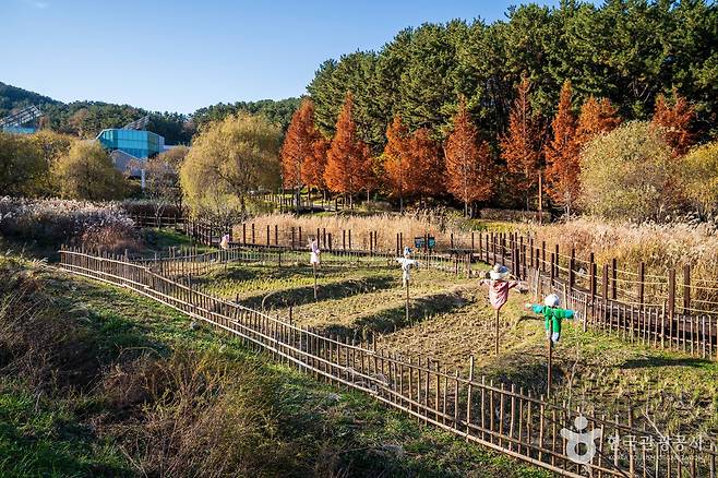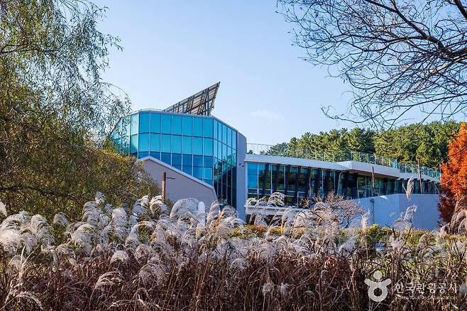 가을에는 논습지 체험장에 황금빛 벼가 익어가고, 허수아비와 억새밭이 조화를 이루며 한 폭의 풍경화를 만들어냅니다. 봄에는 수국과 들꽃이 만발하고, 여름엔 초록 숲길이 산책로를 덮습니다. 가을빛으로 물든 데크산책길을 따라 걸으면 꽃무릇이 붉게 피어 있는 길목, 감이 주렁주렁 열린 감나무, 그리고 빗물을 재활용하는 빗물저금통과새를 보호하기 위한 버드세이버 창문이 눈에 들어옵니다. 이 모든 것이 ‘지속 가능한 숲’이라는 철학의 실천입니다.